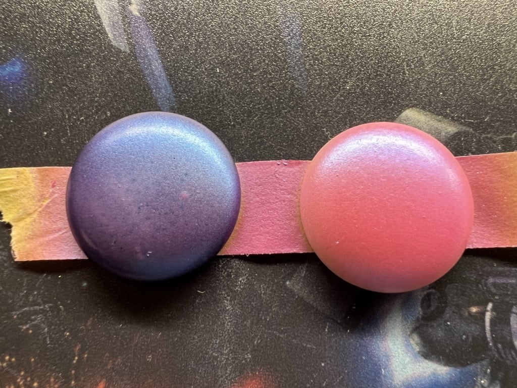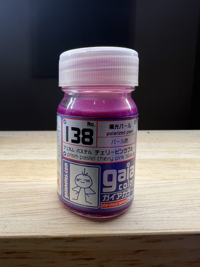 ガイアカラー138(プリズムパステルチェリーピンクブルー)投稿者:mizukusa投稿公開日:2023年1月30日投稿カテゴリー:ガイアカラーレビュー / 塗装レビュー投稿コメント:0件のコメント ガイアノーツさんから新発売のカラーです。左が黒下地 右が白下地です。写真ではわかりにくいですが、黒下地は青みが強く光が当たるところがうっすらピンク色が輝く感じです。白下地はピンク色が強く、光があたれば、ほんの少し青が見える?くらいの偏光です。鮮やかながらも落ち着いたピンクといった感じです。白下地の方がパール感は強く感じる気がします。個人的な感想ですが、個人的には黒下地で青みが強く薄らピンクに輝く方が好みです。 mizukusa 小学生のころからの趣味は「ガンプラ」、最近は美プラやスケールものにも手を伸ばす。我が家にはプラモデルを飾る場所はない。ブログに記録として残す目的で開始しました。1時間/日程度に限られるが毎日嫁と娘の冷たい目を掻い潜り模型活動中です。 おすすめ 塗料プリズムパープルグリーンとプリズムブルーグリーン2024年7月24日 塗料の保管(ドロッパーボトル入れ替え)2024年9月28日 ガイアカラー137(プリズムパステルターコイズブルーイエロー)2023年2月1日コメントを残す コメントをキャンセルコメントコメントする名前またはユーザー名を入力してくださいメールアドレスを入力してコメントWeb サイトの URL を入力してください。(任意) 次回のコメントで使用するためブラウザーに自分の名前、メールアドレス、サイトを保存する。 Δ
